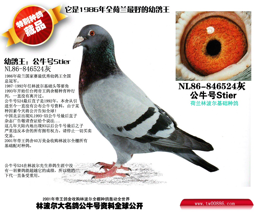 幼鸽王:公牛号Stier 1986年荷兰国家赛最优秀幼鸽王全国